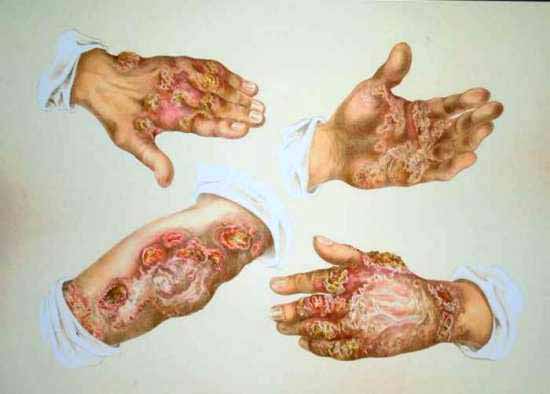 Lupus serpiginosus exulcerans. Farblithographie von Anton Elfinger. Heft I, Tafel 9, 59 x 45 cm (1856)