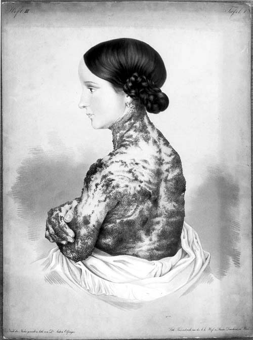 Ferdinand von Hebra schreibt, daß unter dem FischschuppenAusschlag ”jene krankhafte Veränderung zunächst der Epidermis und sodann der Cutis verstanden [wird], welche sich durch Bildung weisser, papierdünner, oder dunkelgefärbter, grüner, brauner bis schwarzer, rauh anzufühlender Epidermalmassen auszeichnet, welche auf der untergelagerten Cutis fest adhäriren, und im Normalzustande die die Oberhaut durchkreuzenden Linien und Furchen in einer viel deutlicheren und prägnanteren Weise hervortreten lassen.” Seit dem Mittelalter haben Ärzte die Ichthyosis durch Vergleiche mit der Haut von Tieren beschrieben. Die verschiedenen Krankheitsbilder erhielten Namen wie Perlmutt, Fischschuppen oder Schlangenhautichthyosis. Dabei handelt es sich immer um Verhornungsstörungen, die in früher Kindheit auftreten, sich bis zur Pubertät steigern und dann im wesentlichen unverändert bleiben. Auffallend ist, daß meist in periodischer Weise jeden Sommer oder nach akuten fieberhaften Krankheiten eine fast vollständige Abschuppung (”Mauserung”) einsetzt. Die Verschuppung beginnt dann neu. Der Patient empfindet in der Regel keine Schmerzen. Nur bei stärkerer Ausprägung können über den Gelenken tiefe Hautrisse (Rhagaden) entstehen. Ichthyose ist eine erbliche Erkrankung. Die Therapie besteht aus zwei Teilen: Zuerst werden durch Einreibungen mit ”grüner Seife” oder durch häufige Bäder die Hornmassen entfernt. Im weiteren Verlauf der Behandlung muß die Haut geschmeidig gehalten und die Bildung neuer Schuppen unterbunden werden. Empfohlen werden wiederum Bäder, in deren Anschluß die Haut mit Vaseline oder einer ”indifferenten Salbe” eingerieben wird.