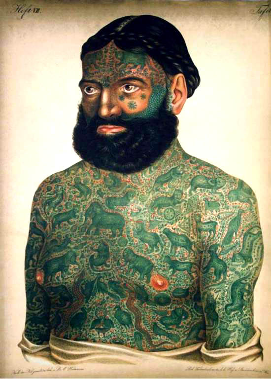 Ferdinand von Hebra hat den tätowierten Mann, den er als kerngesund bezeichnet, für seinen Hautatlas ausgewählt, weil er glaubte, ”die Seltenheit des Falles einer allgemeinen, künstlerisch vollendeten Tättowirung der Haut eines Menschen der kaukasischen Raçe” seinem Publikum nicht vorenthalten zu können. Kuriosität und nicht Krankheit waren ausschlaggebend für die Veröffentlichung. In seiner Beschreibung des Bildes zählt er nicht nur die Gesamtsumme, die Verteilung über die einzelnen Körperregionen, die Farbe, sondern auch die verschiedenen Motive der Tätowierungen, hauptsächlich aus dem Tier und Pflanzenreich, auf. Danach beschreibt er das verwendete Instrument, eine spitze nadelförmige ”Schreibfeder”, mit der die Farbe durch schnelle Stiche in die Haut eingebracht wird. Als Motiv für seine Tätowierung gab der Dargestellte an, ”dass er im Jahre 1867 in der chinesischen Tartarei als Gefangener darum tättowirt worden sei, um seinen Landsleuten als Gebrandmarkter zum abschreckenden Beispiele zu dienen und ihnen ihr Handwerk Schmuggel oder Seeräuberei zu verleiden.”
