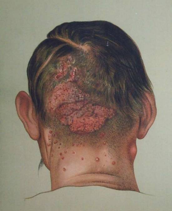 Sycosis framboesiformis. Farblithographie von Carl Heitzmann nach einer Vorlage von Anton Elfinger. Heft X, Tafel 3, 59 x 45 cm (1876)